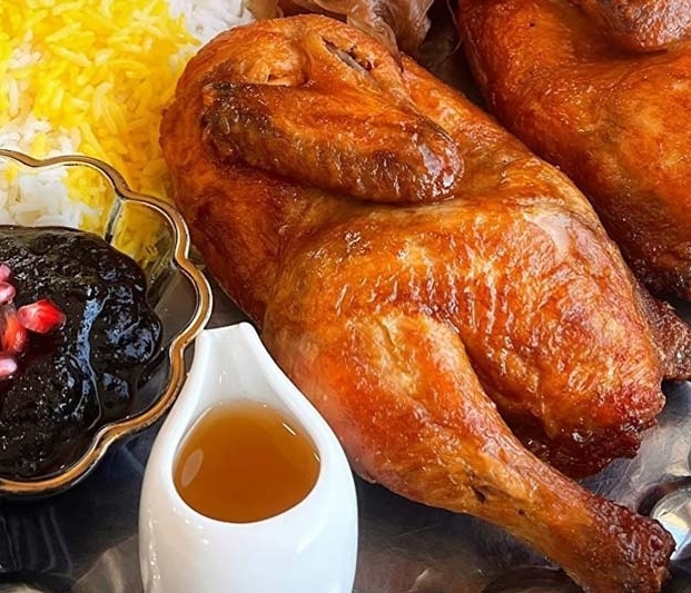 200 گرم جوجه + 1 سیخ کوبیده 100 گرمی + 350 گرم برنج ایرانی درجه ۱ + دورچین
